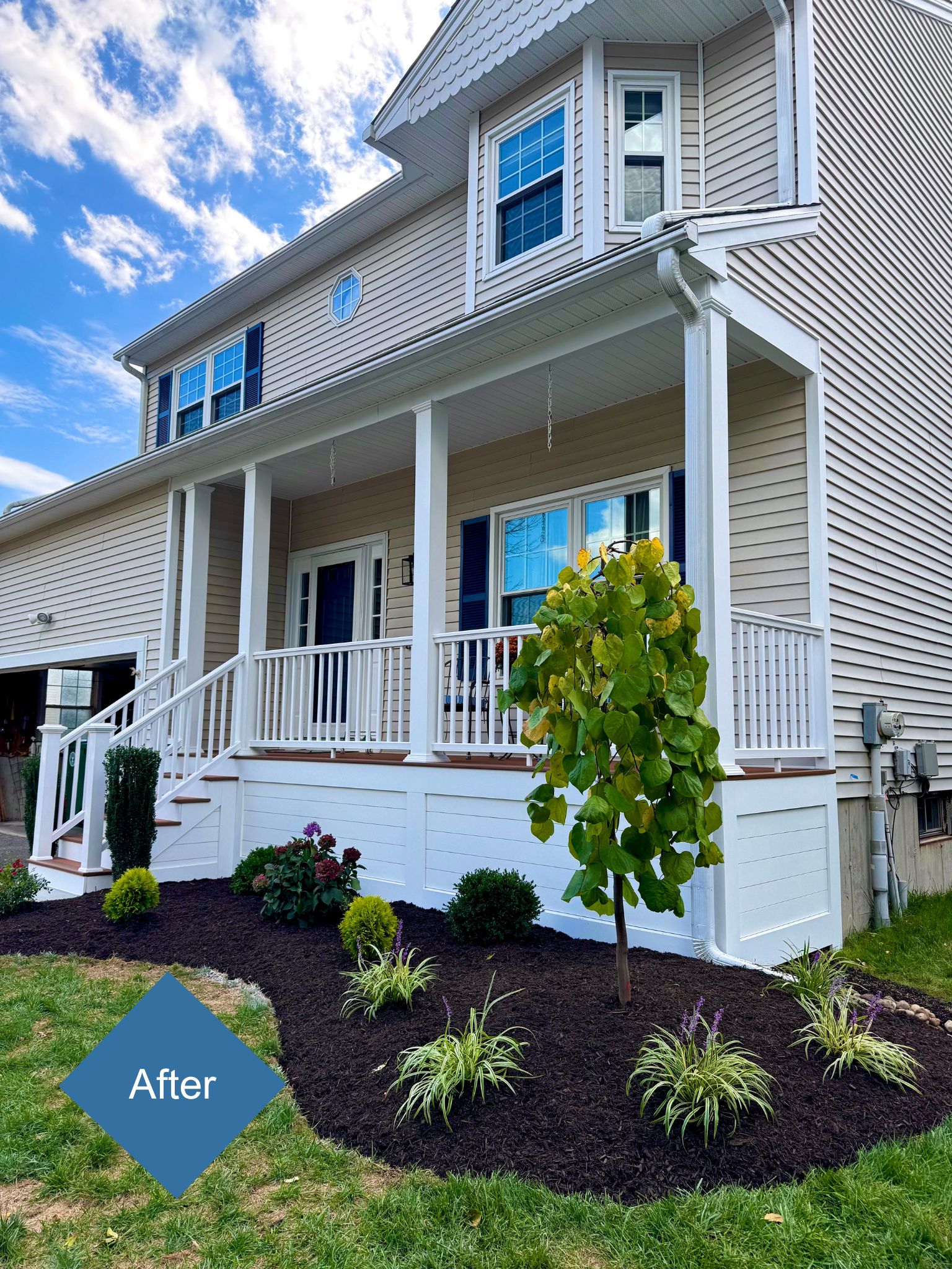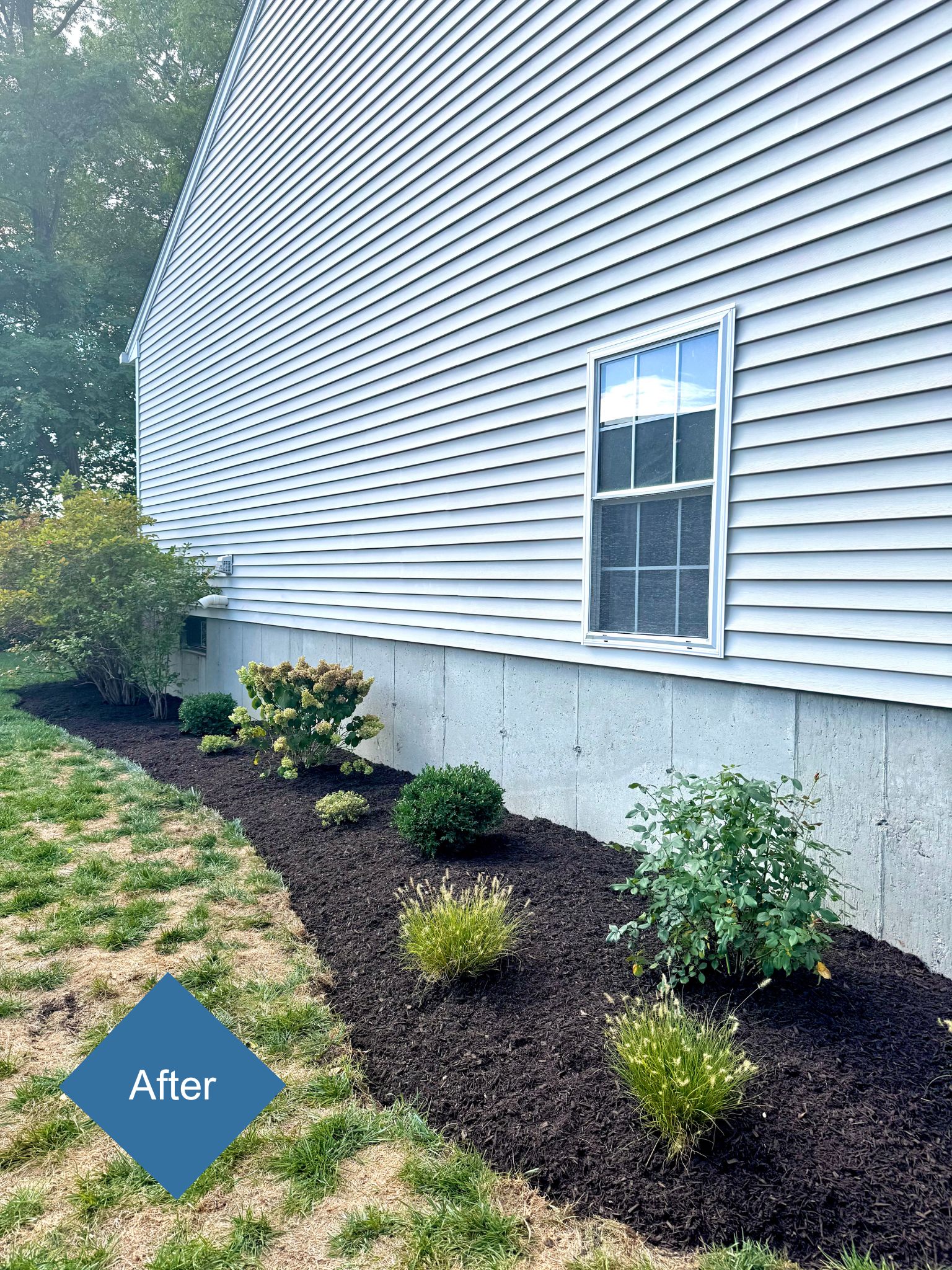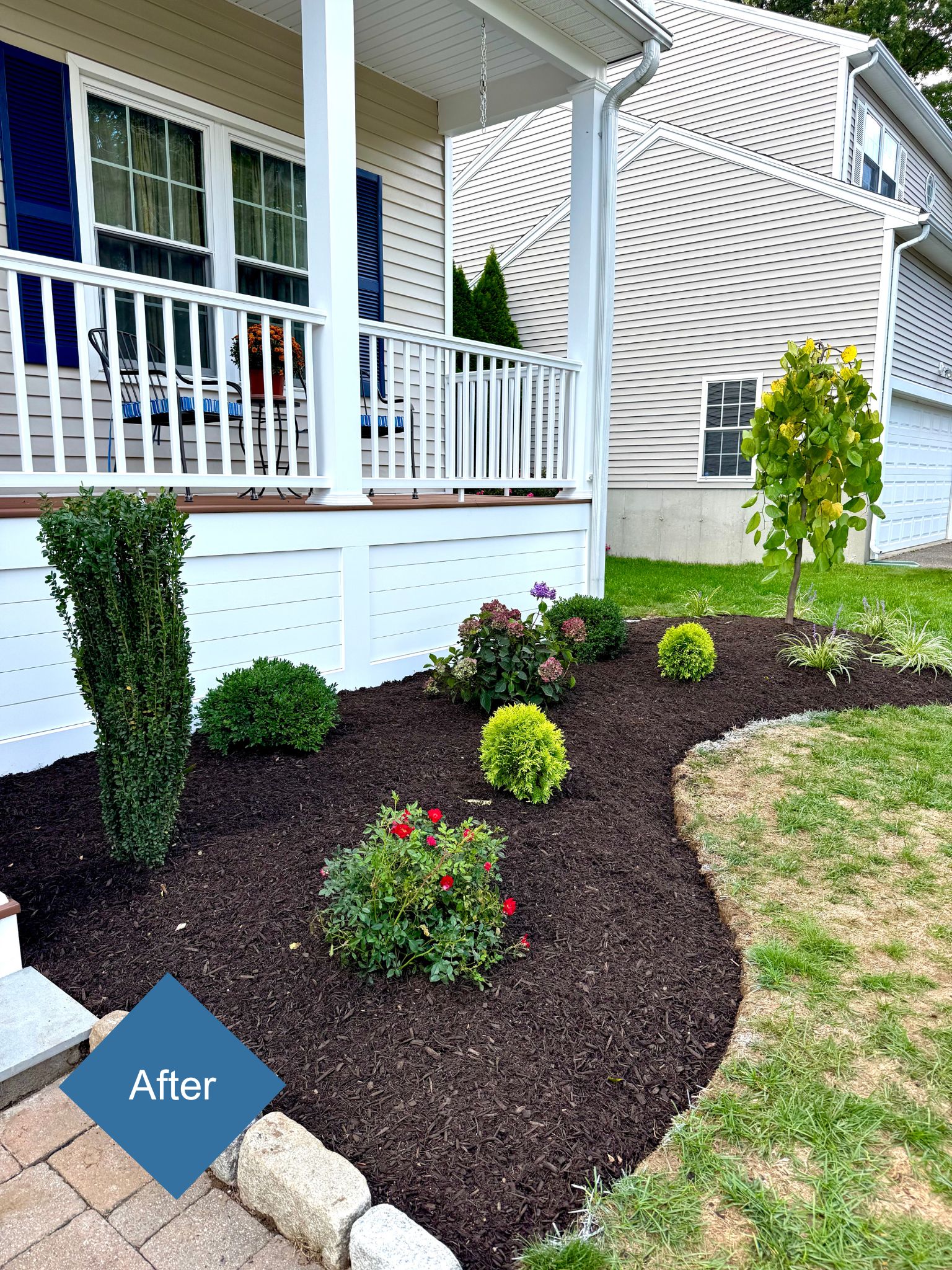 The finished landscape delivers year-round appeal with evergreens for structure, hydrangeas and roses for vibrant blooms, and ornamental grasses and perennials for texture and seasonal interest.