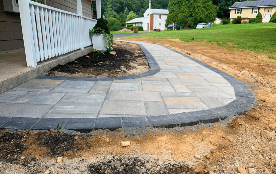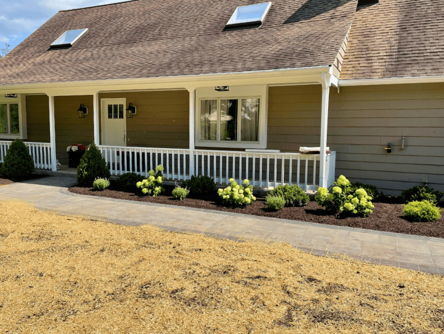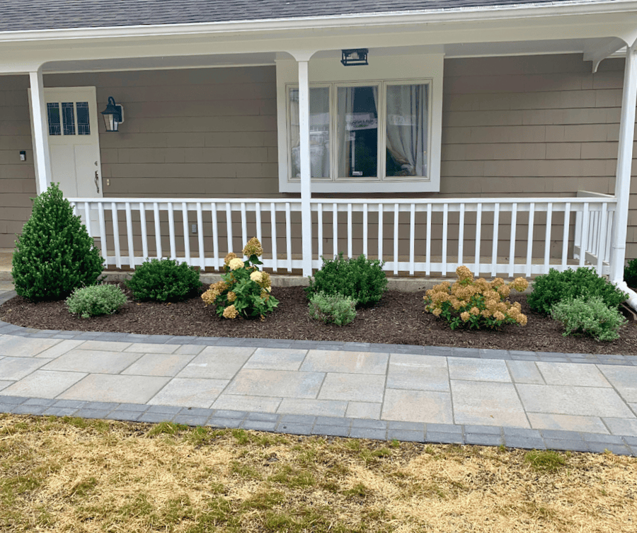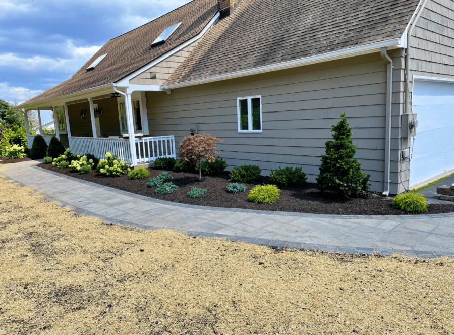 We began by removing the existing concrete and installing a custom paver walkway that connects the front door to the driveway. The homeowner selected pavers to add visual interest and complement the surrounding landscape. Our hardscaping team carefully built the walkway to ensure durability, style, and a seamless blend with the home’s curb appeal.