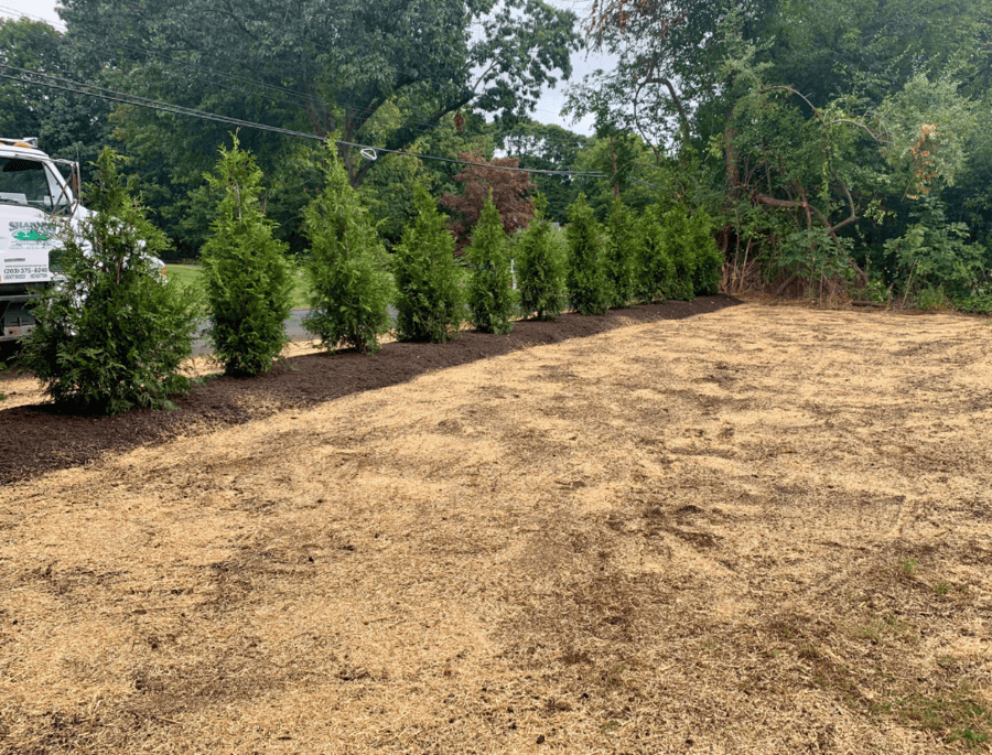The homeowner also chose to add a living privacy wall with Green Giant Arborvitae, a fast-growing evergreen that provides year-round screening. Over time, this natural fence will create stunning privacy and reduce noise, making the property feel more secluded and peaceful. At maturity, these trees can reach 30-50 feet tall! Talk about privacy!
