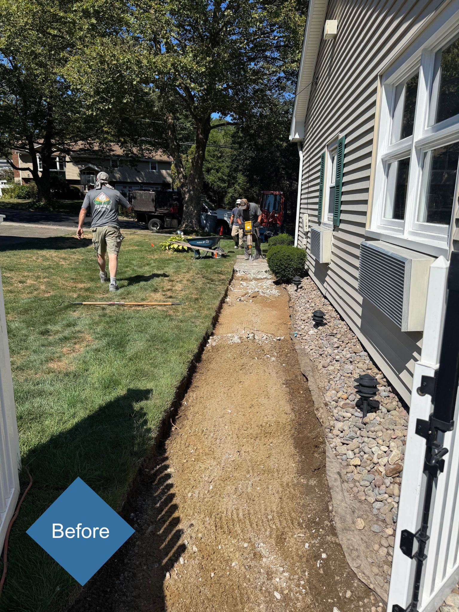 This new walkway is an excellent example of how our landscaping services can improve both the look and functionality of a property. The finished path provides a safe, attractive way to move around the yard, blending seamlessly with the surrounding landscape. Unlike concrete, paver walkways are low-maintenance, resistant to cracking, and add long-term value to outdoor living spaces.